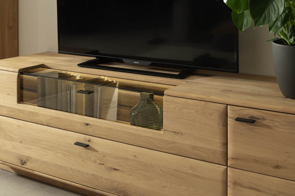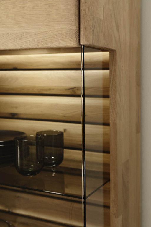 Front Ast/Balkeneiche massiv durchgehende Lamelle in Kristalleiche geölt, Korpus Ast/Balkeneiche massiv keilgezinkt in Kristalleiche geölt, Glas Parsol braun, Griffe Metall anthrazit, bestehend aus: