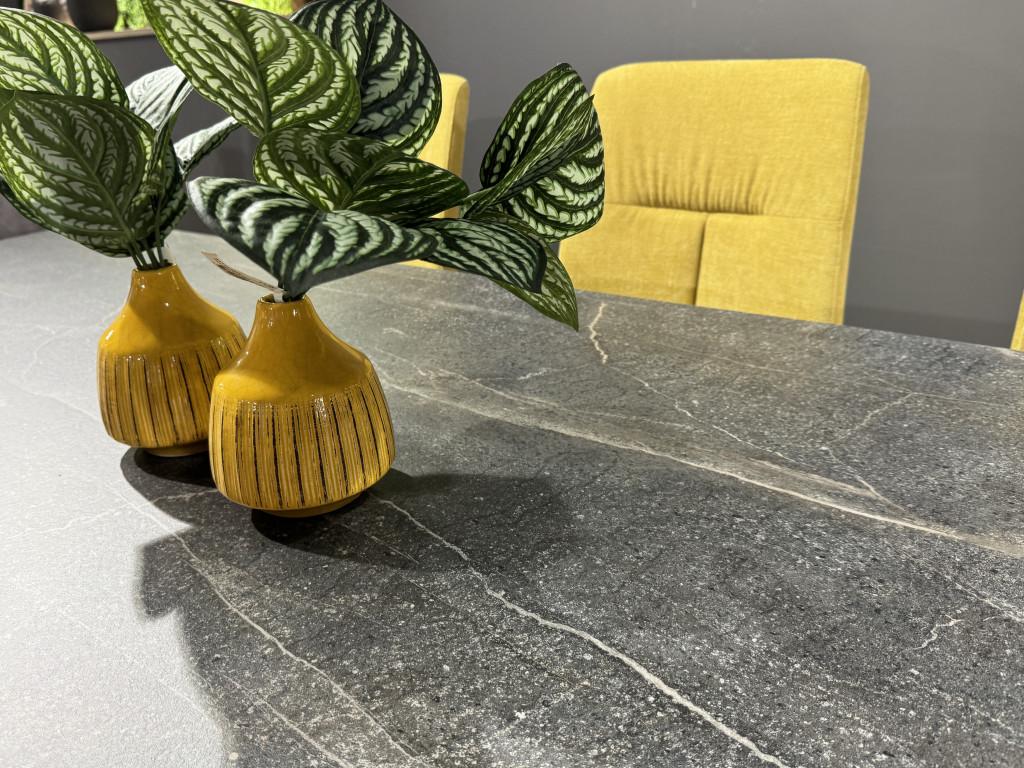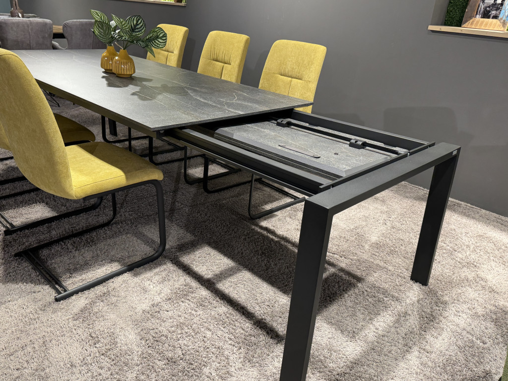 Esstisch 220x100 cm inkl. Auszug 100cmPlatte: Dekor Candela anthrazit,Gestell: Metall anthrazit matt6x SchwingstuhlBezug: Stoff Waren gelb,Gestell: Metall anthrazit matt,inkl. Ledergriff anthrazit